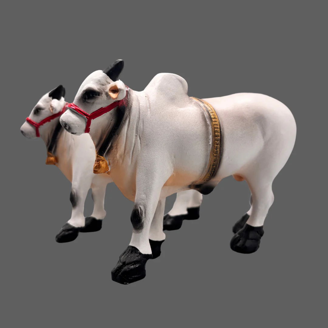Discover the exquisite craftsmanship and cultural elegance with our Small Fiber Ongole Bull Pair. Each piece is meticulously handcrafted from high-quality fiber, measuring 6.5 inches in length and 5 inches in height, making it a perfect fit for any space that values sophistication and tradition.